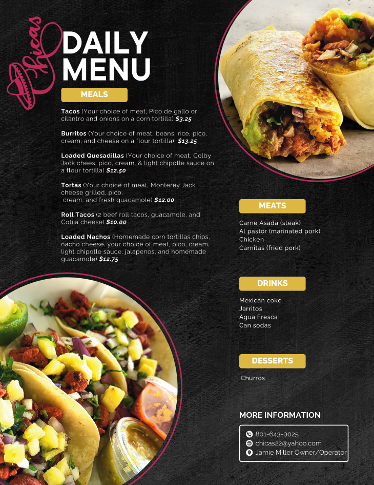 Take a look at our menu below. Click on the menu to enlarge.